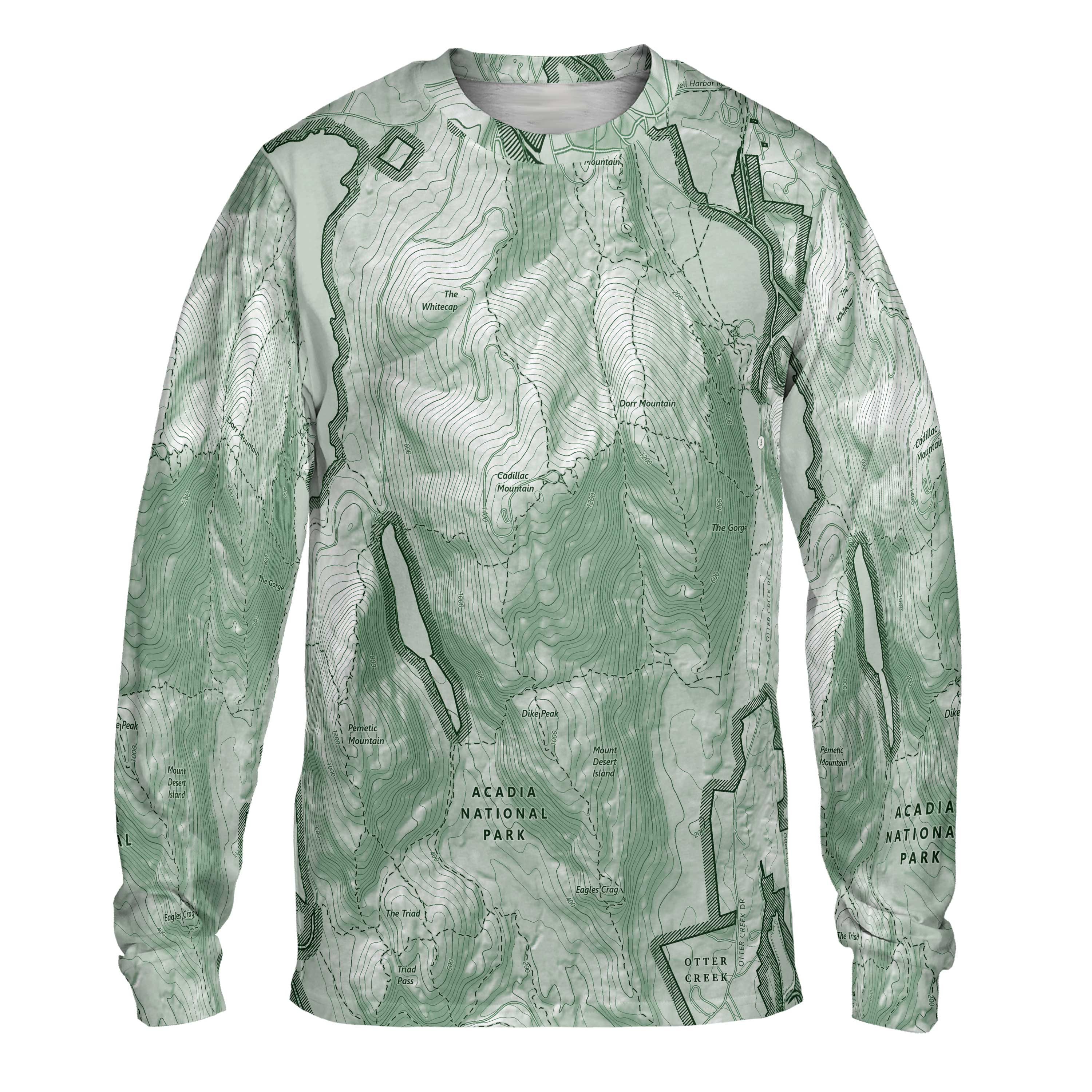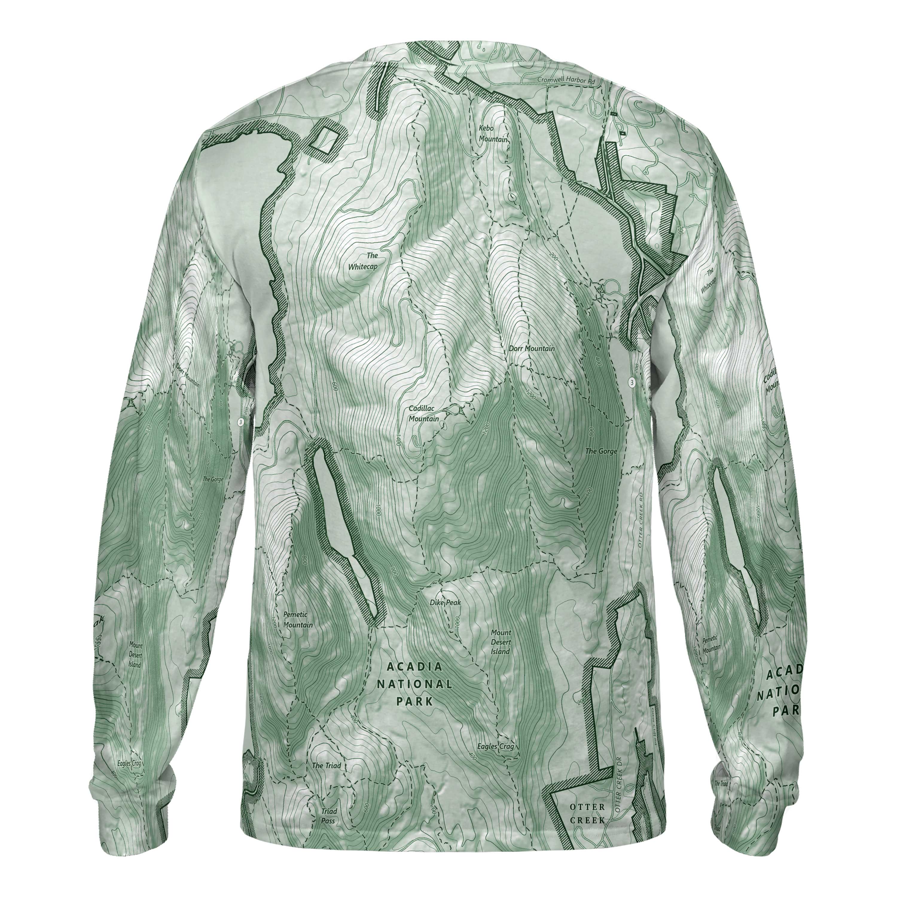Cadillac Mountain is a place defined by light. Granite slopes rise above the Atlantic, spruce and fir give way to open rock, and the horizon stretches from Bar Harbor to the scattered islands offshore. This long-sleeve performance tee reflects that landscape, tracing the rounded summit, the ridgeline trails, and the coastline that frames the view. Anyone who’s climbed in the dark for sunrise, felt the wind sweep across the exposed granite, or watched the first light spill over Frenchman Bay will recognize the lines in this design.