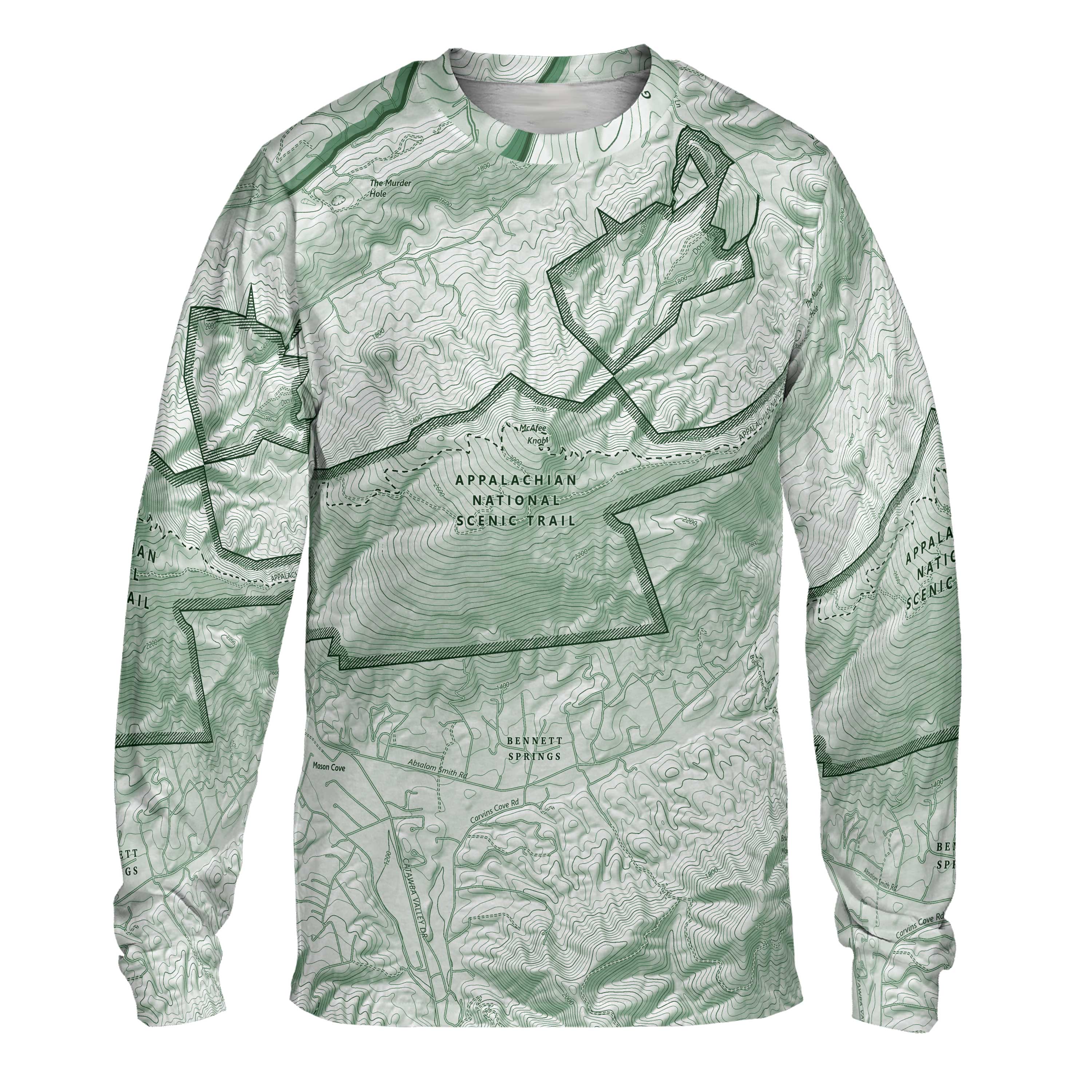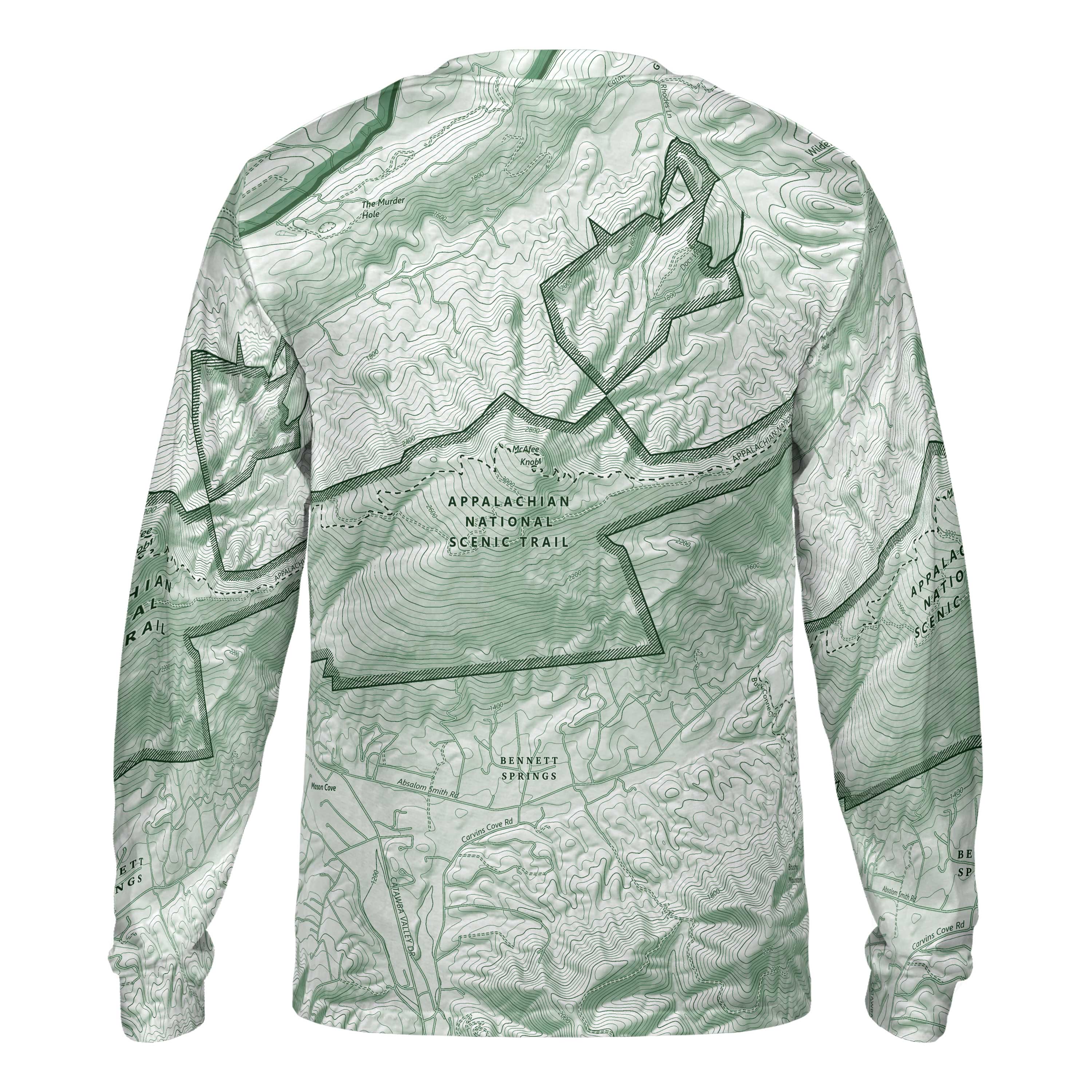 McAfee Knob is a destination that earns its reputation. A steady climb through hardwood forest gives way to one of the most iconic overlooks on the Appalachian Trail—a rock ledge extending into open air, with the Catawba Valley stretching wide below. This long-sleeve performance tee draws from that route, tracing the switchbacks, wooded ridgelines, and the unmistakable curve of the overlook itself. Anyone who’s stepped out onto the rock, felt the wind rise from the valley, or watched the Blue Ridge layers fade into the distance will recognize the lines in this design.