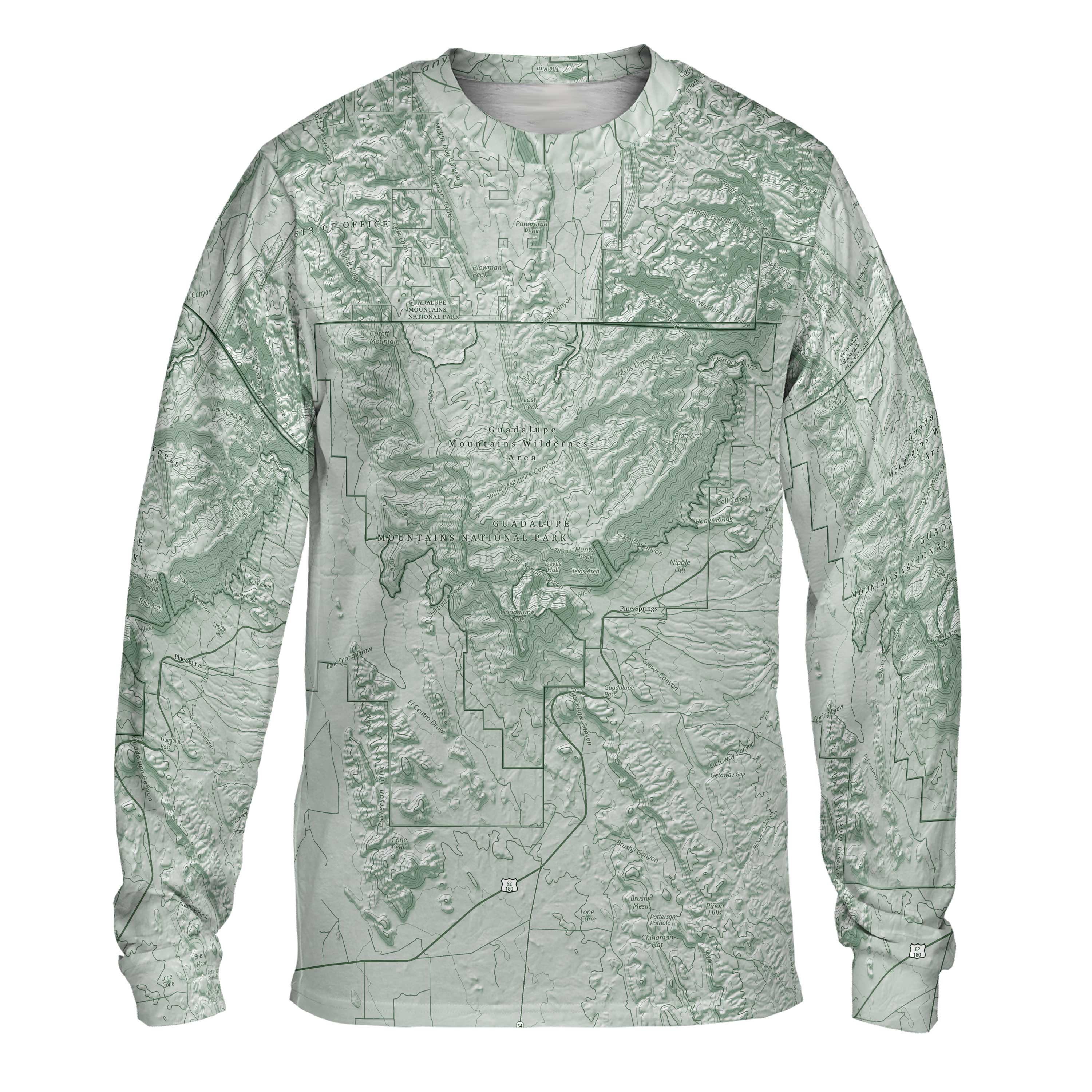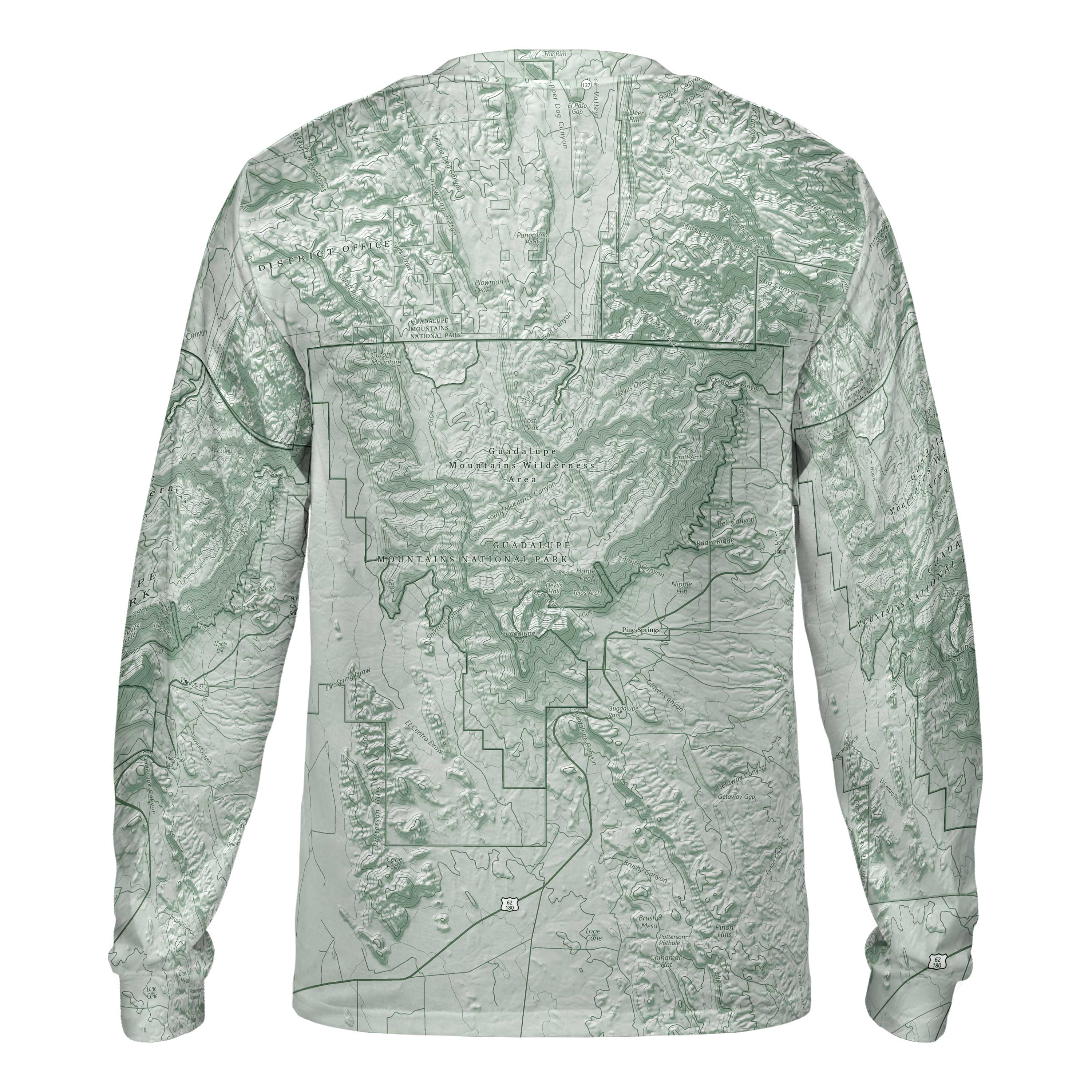 The Guadalupe Mountains reward people who are willing to climb a little higher. High desert flats, fossil-rich canyons, and the highest peaks in Texas—it’s all here, connected by long trails, steady wind, and wide-open skies. This tee reflects that terrain, from the broad salt basin below to the switchbacks rising toward Guadalupe Peak. Anyone who’s pushed up Devil’s Hall, followed the Permian Reef, or watched weather roll in from the west will recognize the lines on this map.