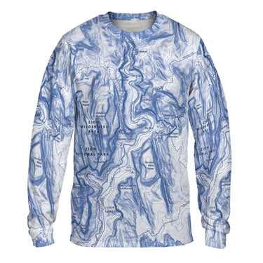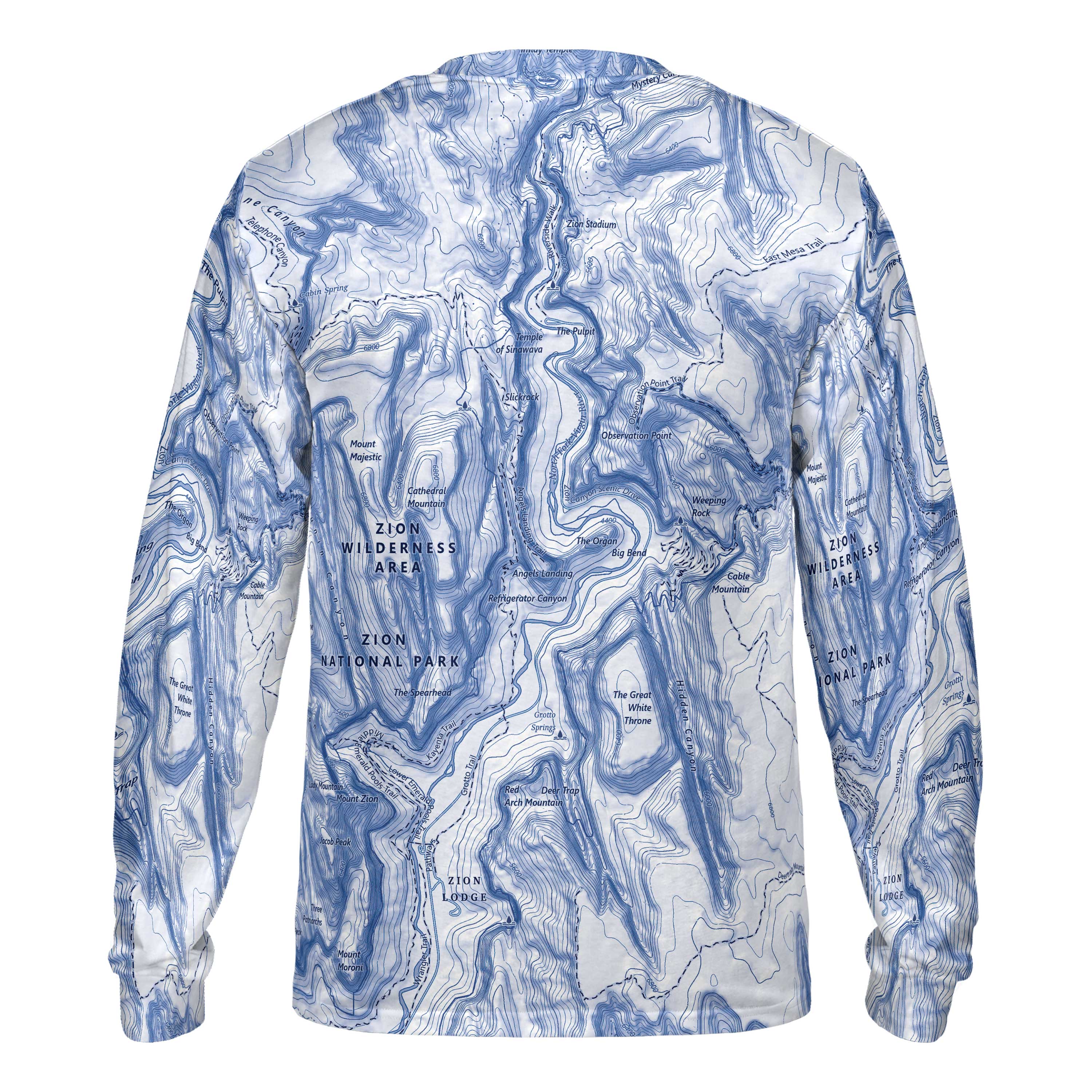 Angels Landing is a trail that asks for focus. A narrow fin of sandstone rising above Zion Canyon, steep drop-offs on both sides, and views that open wider with every step—it’s a hike where awareness matters as much as strength. This long-sleeve performance tee pulls from that route, tracing the switchbacks of Walter’s Wiggles, the exposed spine guarded by chains, and the cliffs that frame the climb. Anyone who’s felt the exposure underfoot, waited their turn along the chains, or looked down at the Virgin River far below will recognize the lines in this map.