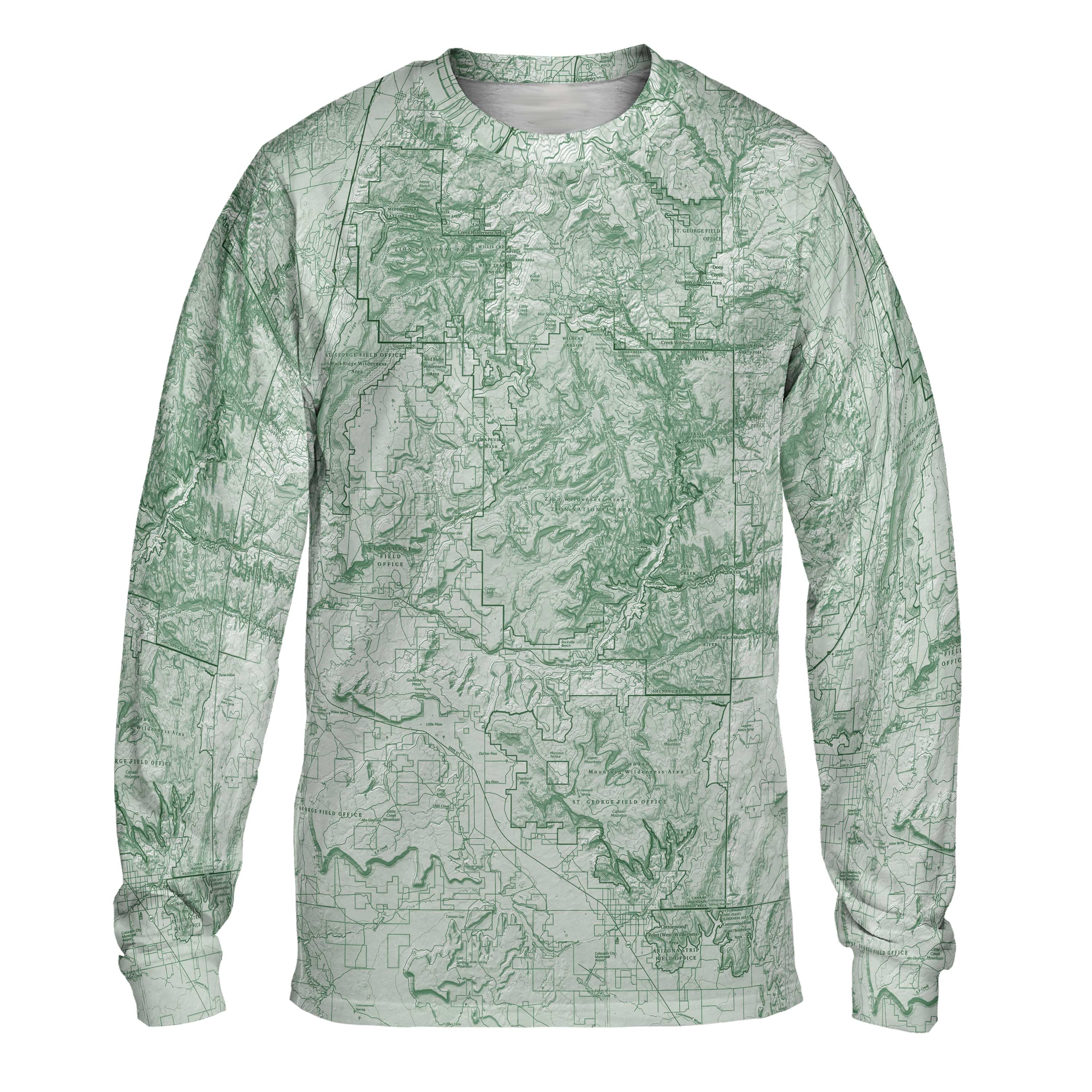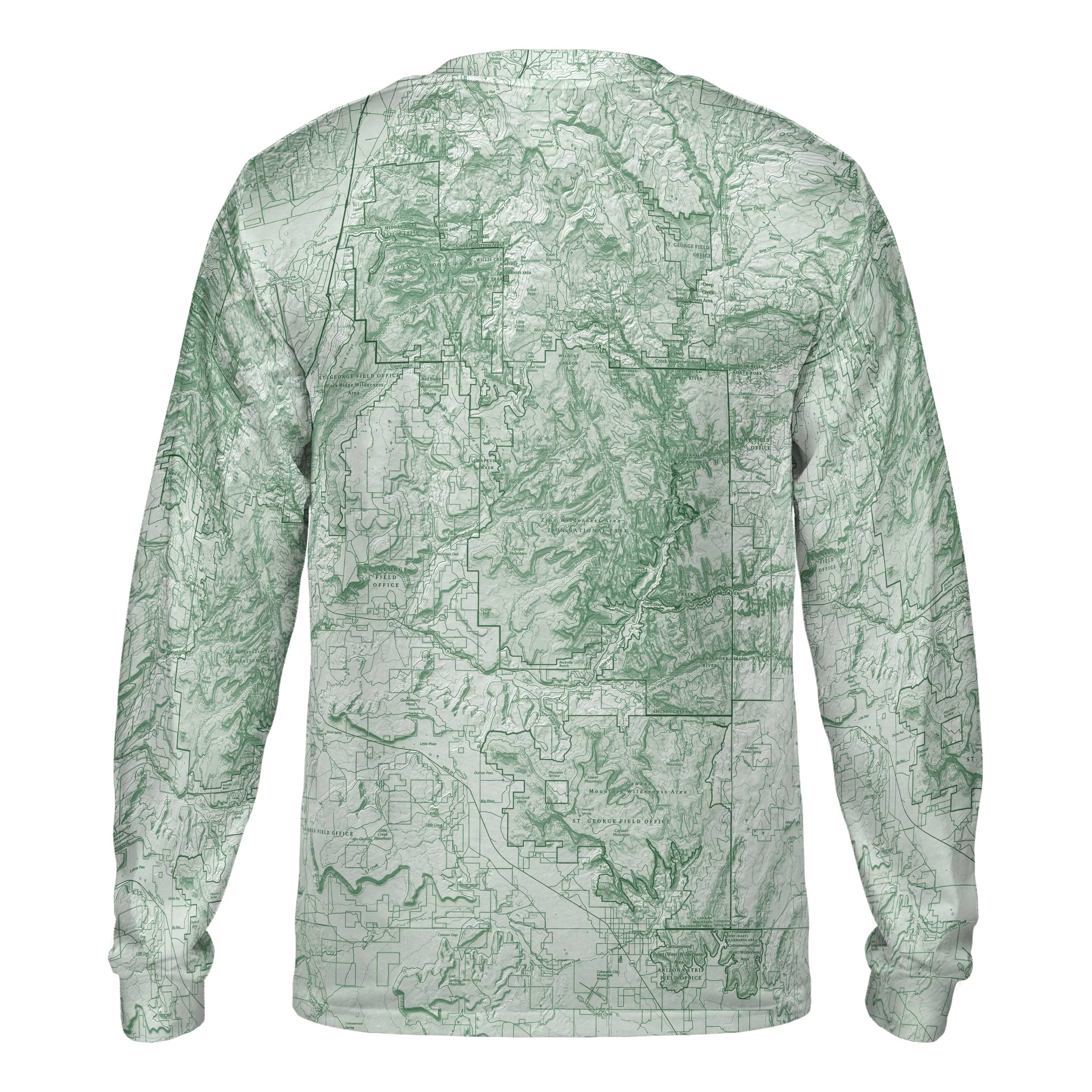 Zion National Park is a place of contrast and scale. Sheer sandstone walls rise from the canyon floor, narrow corridors open suddenly into wide views, and every trail feels shaped by water and time. This long-sleeve performance tee reflects that landscape, tracing the bends of the Virgin River, the vertical walls of the main canyon, and the routes that climb from shaded narrows into open slickrock. Anyone who’s walked beneath towering cliffs, felt cool air give way to desert heat, or watched light move across the canyon walls will recognize the lines in this map.