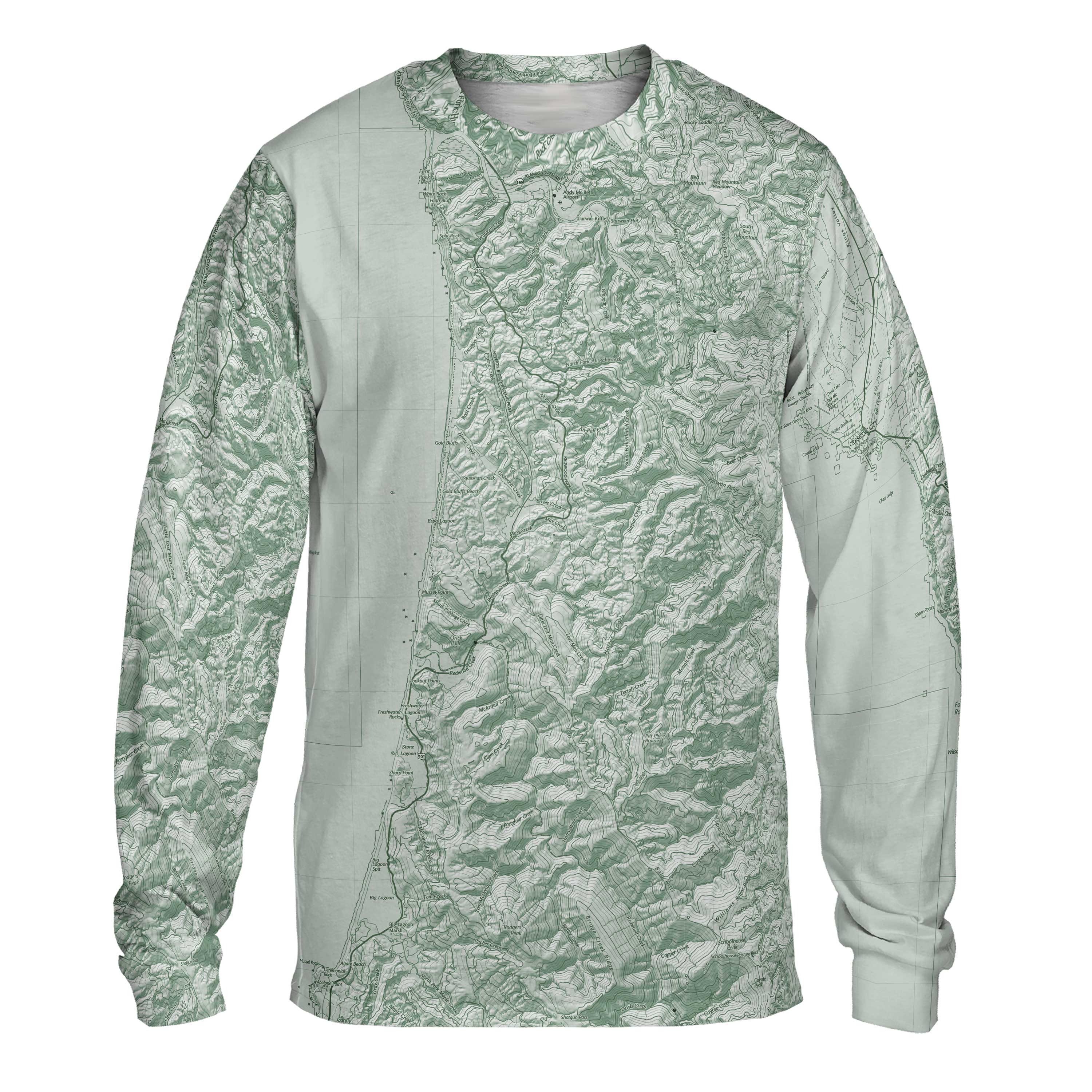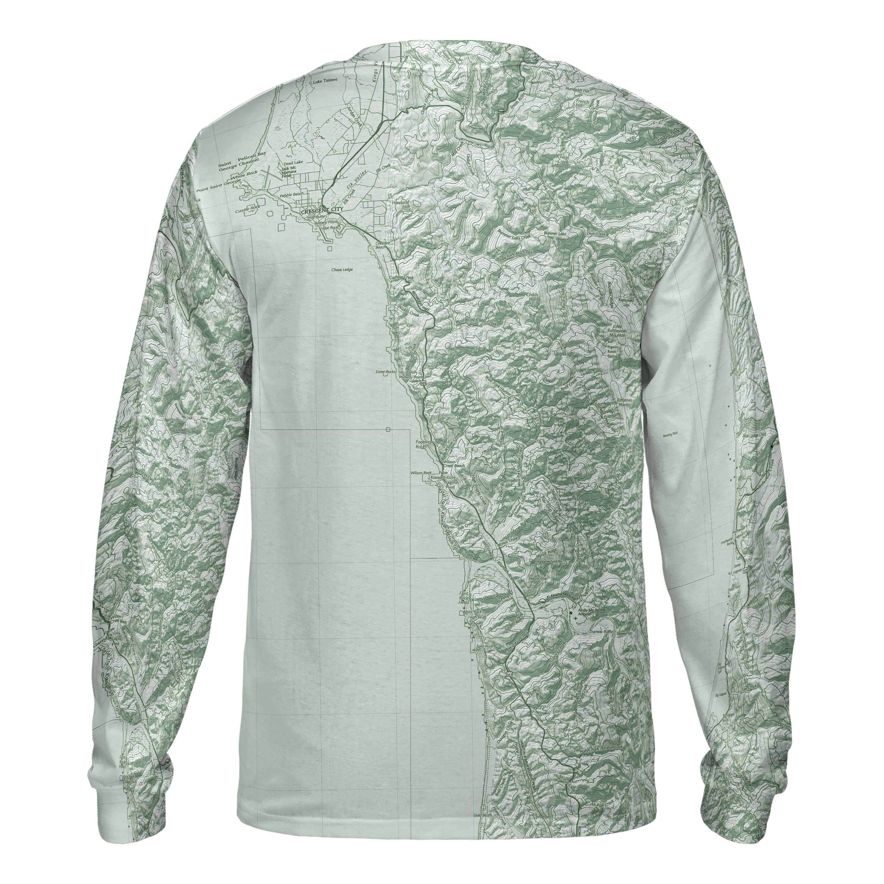 Redwood country changes your sense of scale. Trees older than cities rise into the fog, ferns blanket the forest floor, and soft light filters through in a way that makes people stop talking for a minute. This tee maps the trails and roads weaving through the groves and out toward the coastline, the kind of layout anyone who’s driven Howland Hill Road or walked among the giants of Prairie Creek will recognize.
